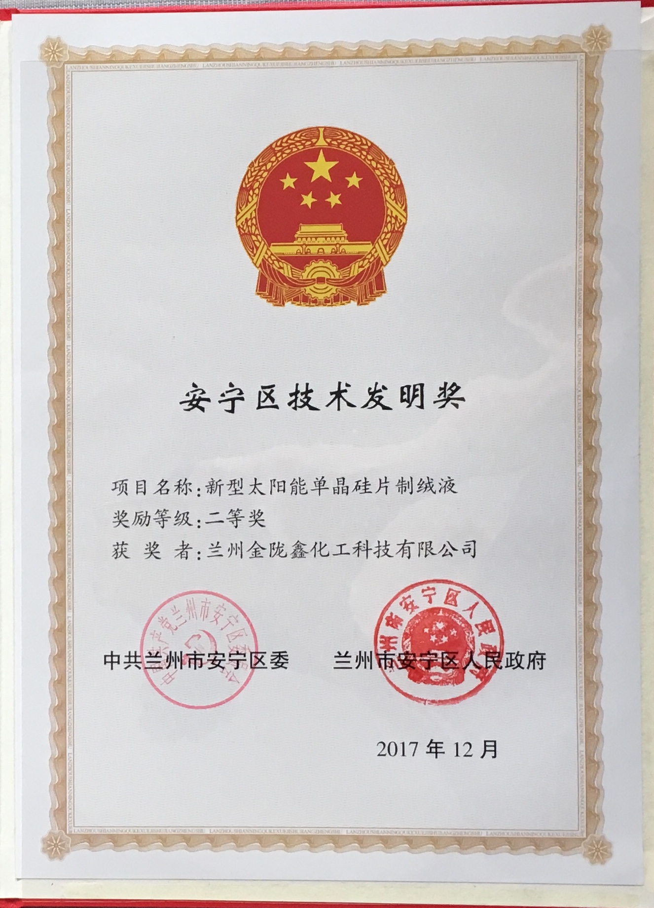 恭喜我公司項(xiàng)目《新型太陽能單晶硅片制絨液》獲得安寧區(qū)科技發(fā)明獎(jiǎng)二等獎(jiǎng),同時(shí)感謝技術(shù)部全體人員為公司的發(fā)展所做出的巨大貢獻(xiàn)。希望你們再接再厲創(chuàng)造更大的輝煌!