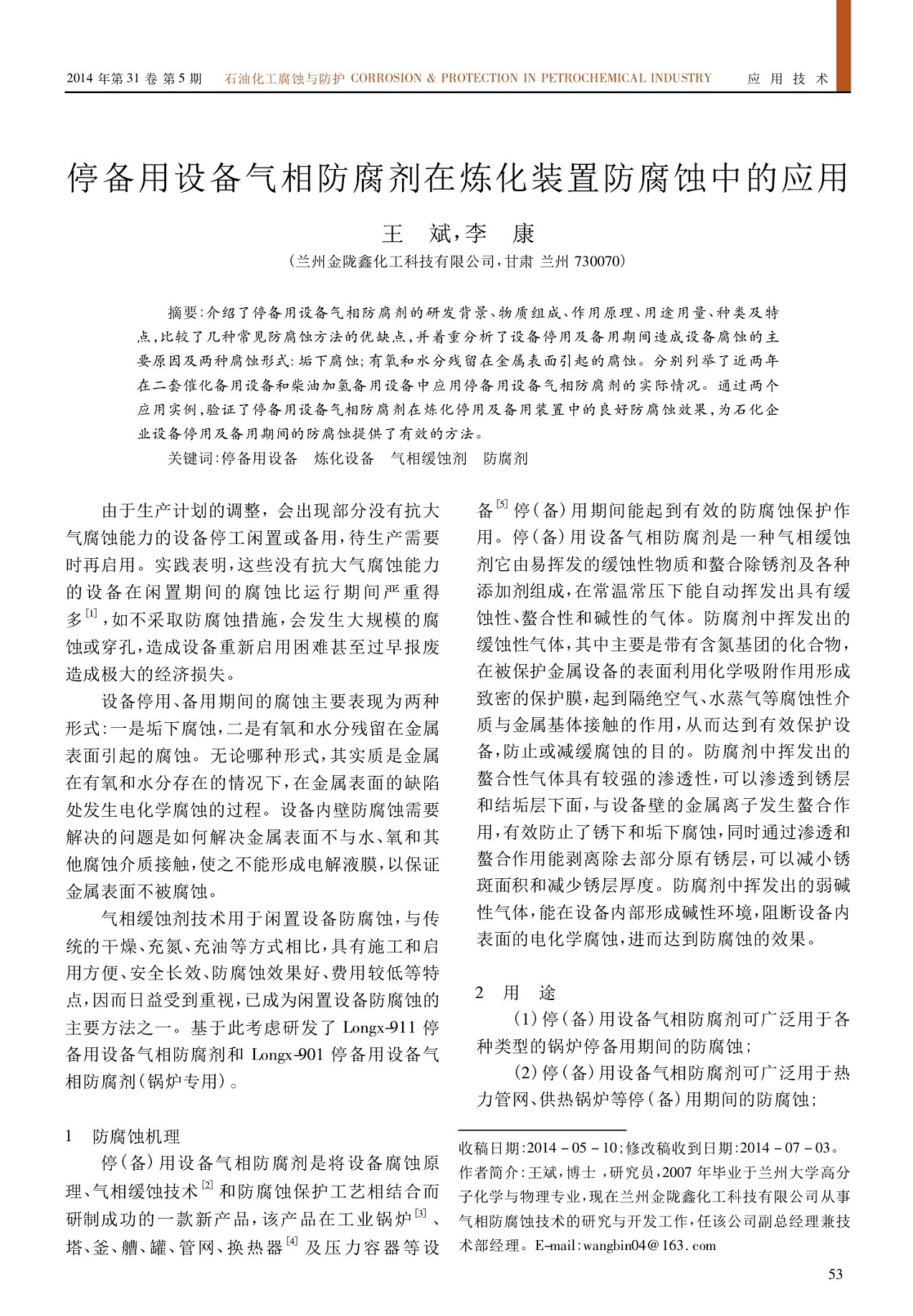 《停備用設(shè)備氣相防腐劑在煉化裝置防腐蝕中的應(yīng)用》文章正式出版